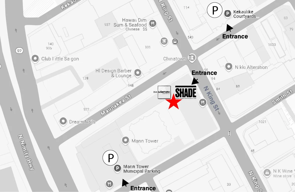 Parking is very close (see below). SHADE is between Marin Tower parking (off Smith Street, 918 Smith St, Honolulu, HI 96817) and Kekaiulike Courtyard parking (off Maunakea,1016 Maunakea St, Honolulu, HI 96817).