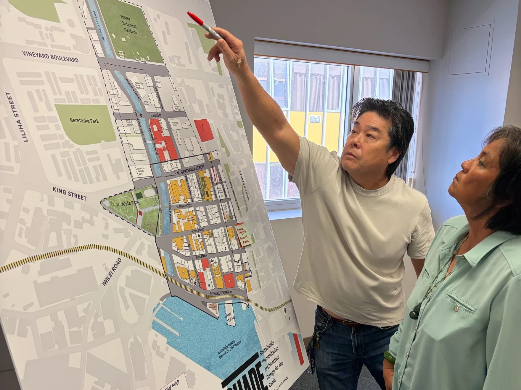 HPR's Catherine Cruz, right, with Dean Sakamoto of the SHADE Institute in Chinatown on Oct. 22, 2025. Featured on HPR website.
